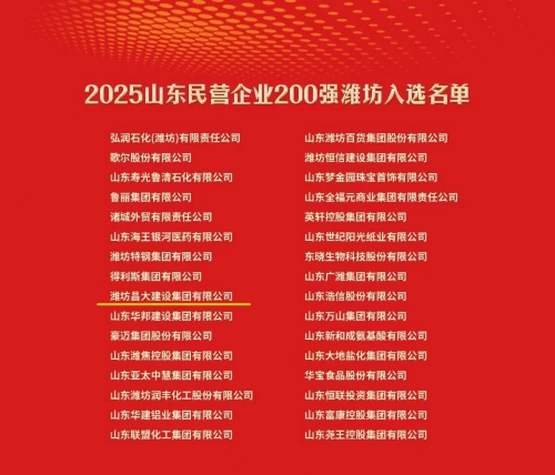 会上,昌大建设集团凭借稳健的发展、突出的行业贡献及良好的社会口碑,不仅入选2025潍坊市50强企业名单,还连续荣获2025山东民营企业200强等多项省级荣誉。同时集团所属泰和置业有限公司还获得2025山东民营企业服务业100强等省级荣誉,充分彰显了集团作为潍坊建筑业领军企业的实力、地位和作用。
