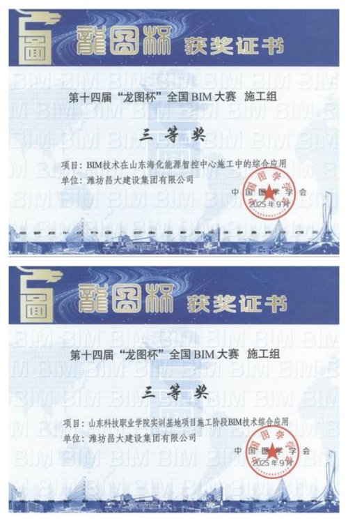 二则是,由中国图学学会举办的第十四届“龙图杯”全国BIM大赛公布了获奖结果。集团公司申报的《BIM技术在山东海化能源智控中心施工中的综合应用》、《山东科技职业学院实训基地项目施工阶段BIM技术综合应用》均获三等奖。实现历史新突破。