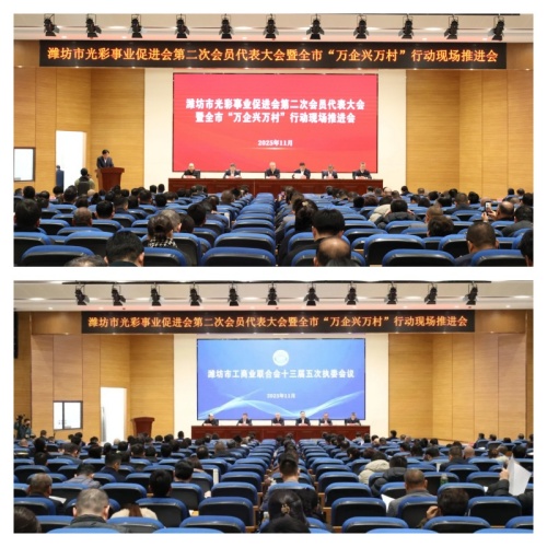 2025年11月18日,潍坊市光彩事业促进会第二次会员代表大会暨全市“万企兴万村”行动现场推进会在潍坊寿光召开。市委常委、秘书长、统战部部长赵绪春出席会议并讲话,寿光市委书记李鹏致辞,市委统战部分管日常工作的副部长李全吉主持会议,市委统战部副部长、市工商联党组书记、常务副主席刘兴成当选市光彩事业促进会会长。集团总裁朱九洲当选市光彩事业促进会副会长并作表态发言。